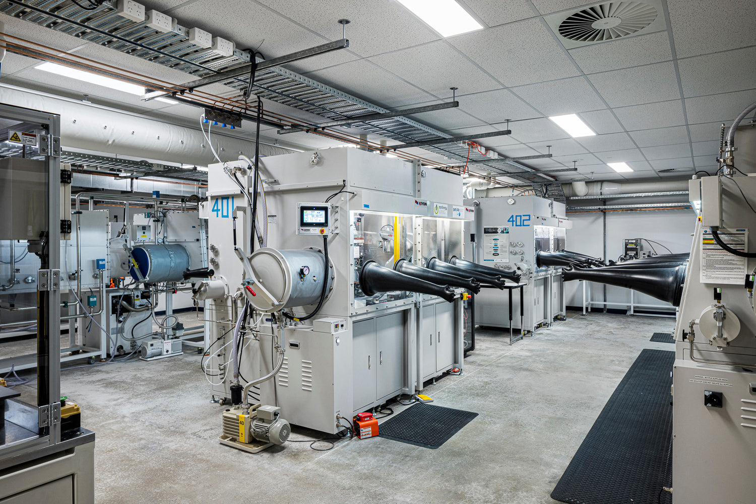 Deakin University’s dedicated laboratory space for battery cells, packs and systems testing, electrochemical testing of commercial batteries is undertaken as well as design and discover new battery advances (high energy batteries, sustainable batteries, safer materials for batteries).