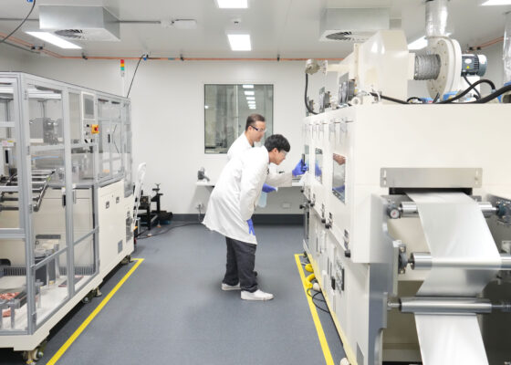 A roll-to-roll coater with three ovens allows us to perform both continuous and intermittent coating of slurries to manufacture the electrodes with the desired coating width, length and patterns.